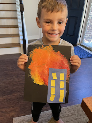 Another community helper: fire fighters. Joseph used paint to make flames.